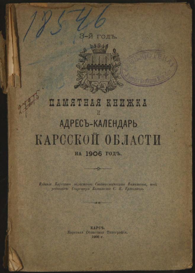 Памятная книжка и адрес-календарь Карсской области на 1906 год.