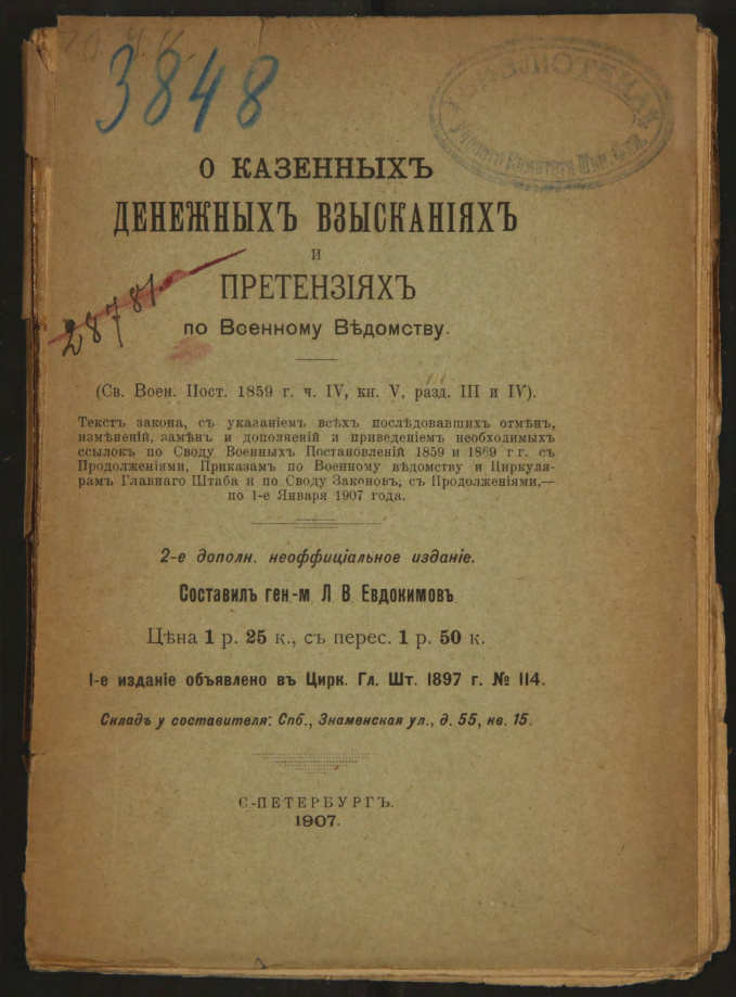 О казенных денежных взысканиях и претензиях по Военному Ведомству.