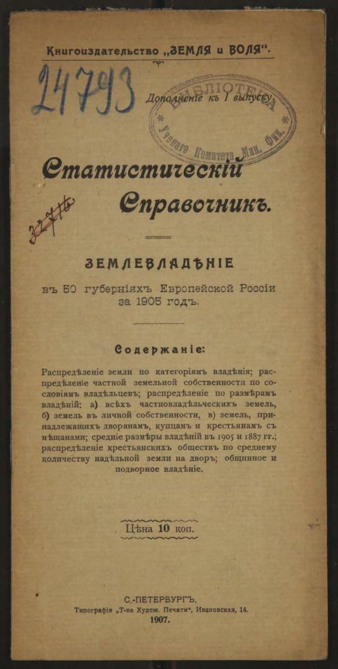 Статистический справочник. Дополнение к I выпуску. Землевладение в 50 губерниях Европейской России за 1905 год.