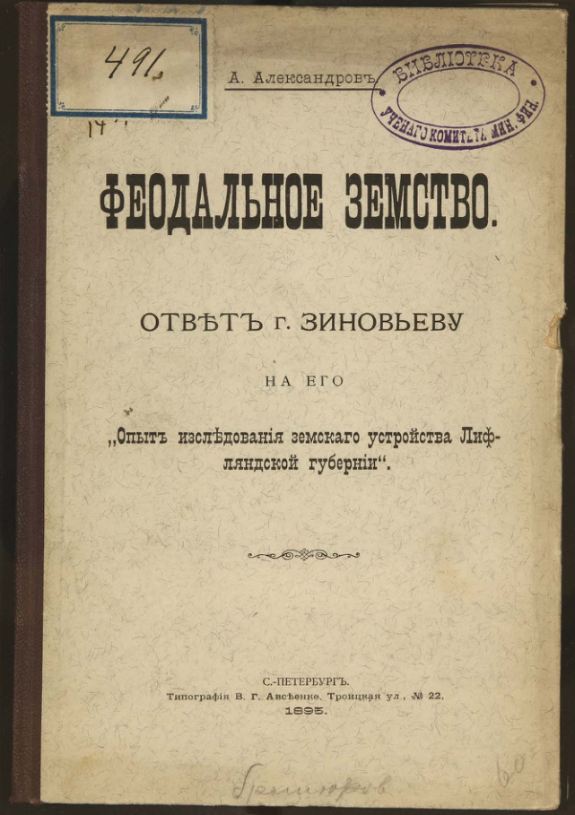 Феодальное земство. Ответ Г. Зиновьеву на его "Опыт исследования земского устройства Лифляндской губернии".