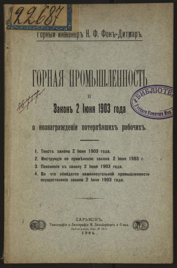 Горная промышленность и закон 2 июня 1903 года о вознаграждении потерпевших рабочих.