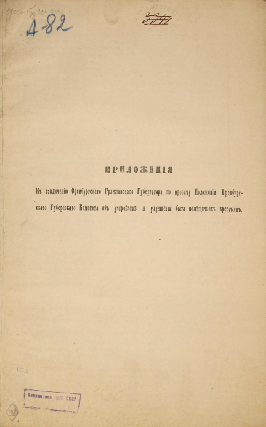 Приложения к заключению Оренбургского Гражданского Губернатора по проекту положения Оренбургского Губернского Комитета об устройстве и улучшении быта помещичьих крестьян