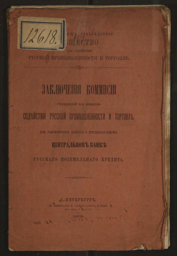 Заключения Комиссии, учрежденной при Обществе содействия русской промышленности и торговле, для рассмотрения вопроса о предполагаемом Центральном банке русского поземельного кредита.