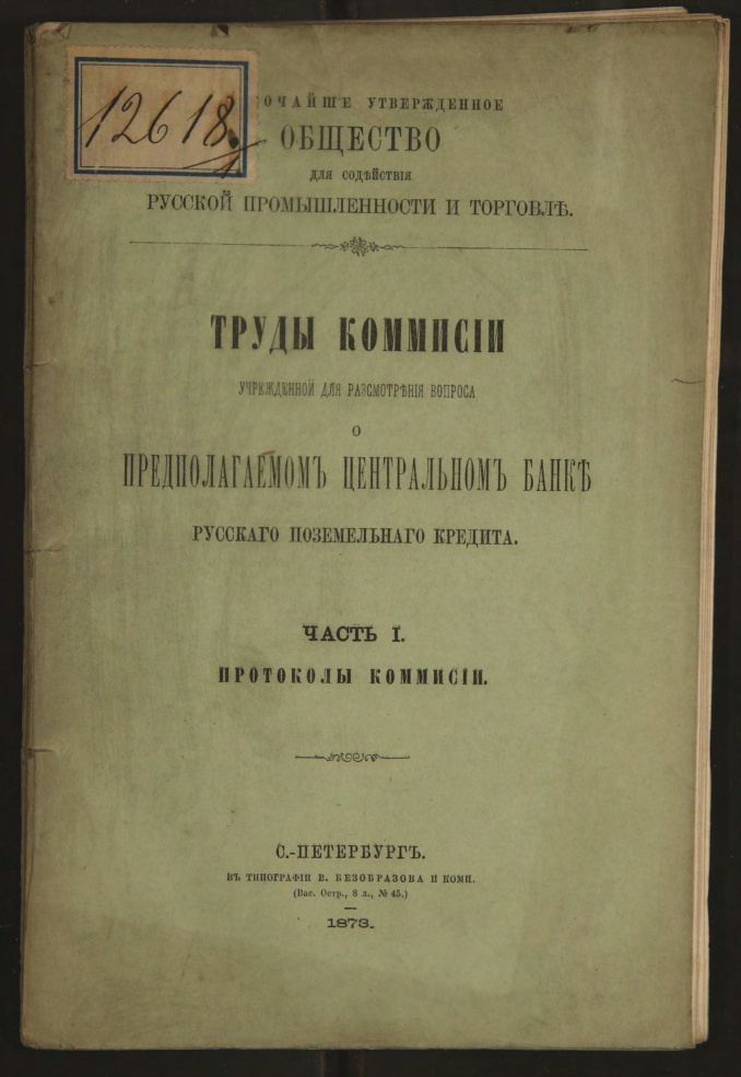Труды Комиссии, учрежденной при Обществе содействия русской промышленности и торговле, для рассмотрения вопроса о предполагаемом Центральном банке русского поземельного кредита. Часть I.
