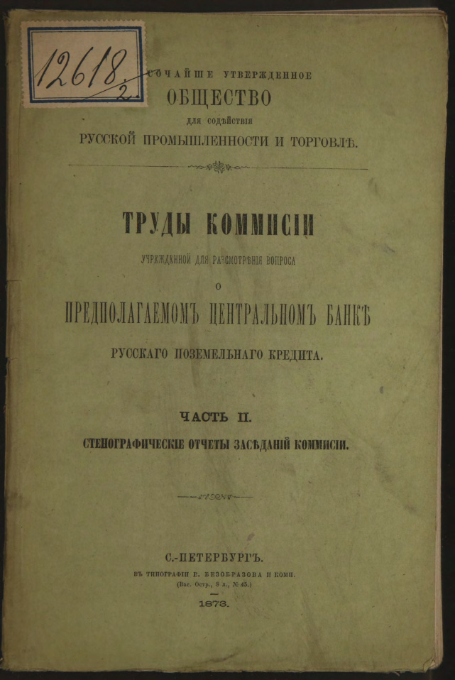 Труды Комиссии, учрежденной при Обществе содействия русской промышленности и торговле, для рассмотрения вопроса о предполагаемом Центральном банке русского поземельного кредита. Часть II.