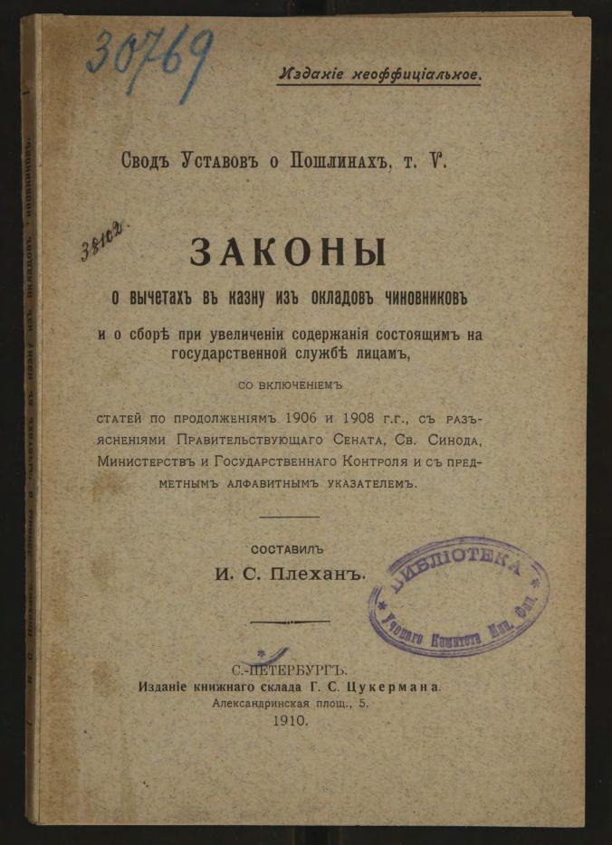 Законы о вычетах в казну из окладов чиновников и о сборе при увеличении содержания состоящим на государственной службе лицам…