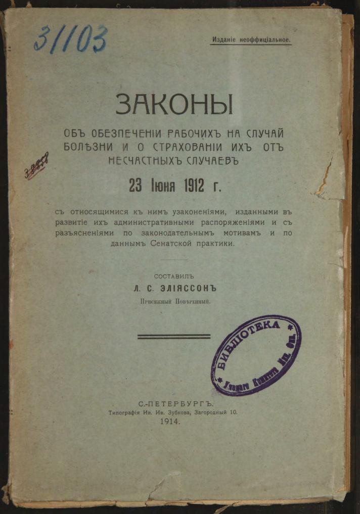 Законы об обеспечении рабочих на случай болезни и о страховании их от несчастных случаев 23 июня 1912 г.
