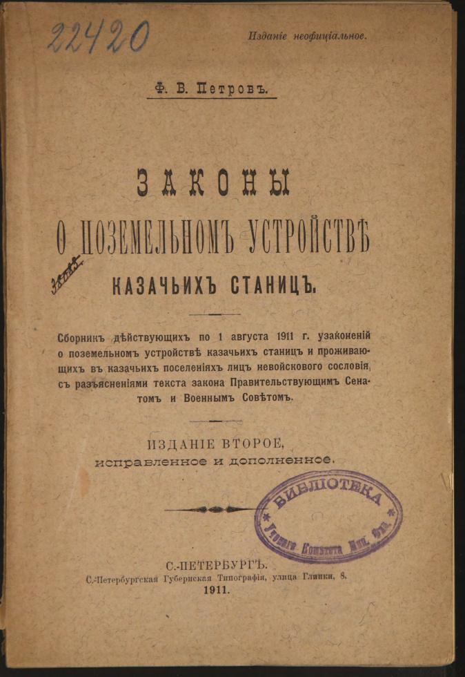 Законы о поземельном устройстве казачьих станиц. Издание второе.