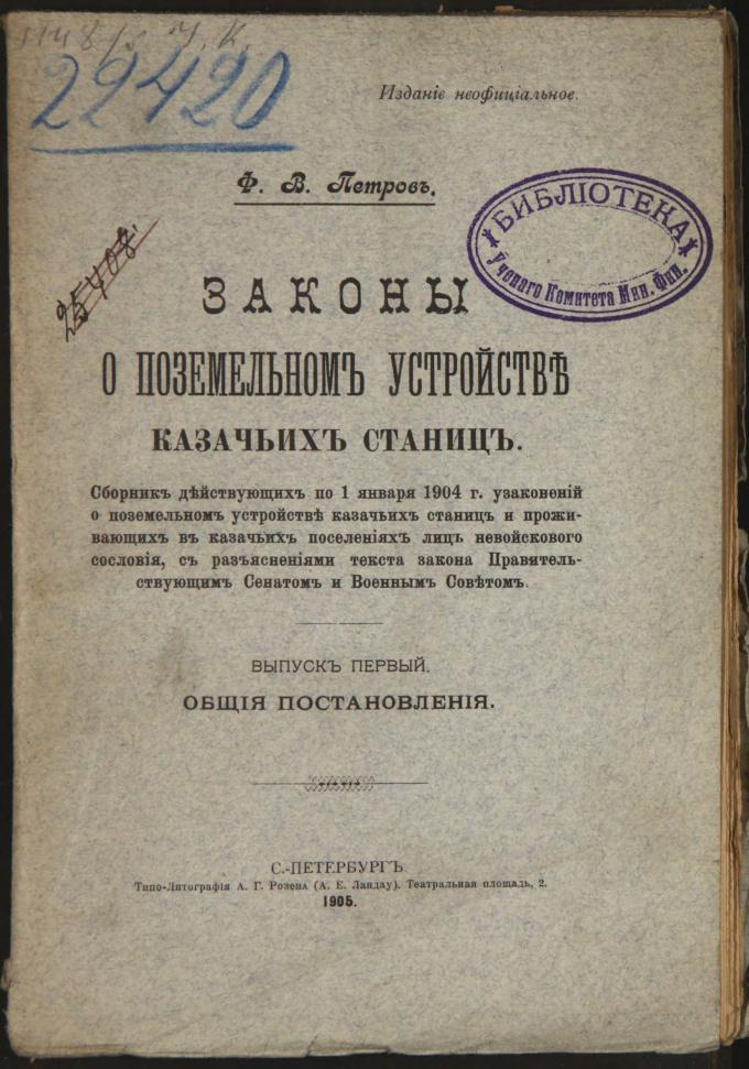 Законы о поземельном устройстве казачьих станиц. Выпуск первый. Общие постановления.