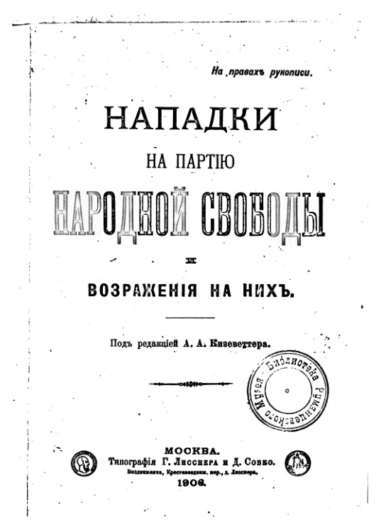 Политическая полемическая брошюра, составленная вскоер после разгона II Думы. Вначале идут кратко изложенные нападки со стороны революционных партий и подробные ответы на них, затем нападки октябристов, со столь же основательными ответами. Под конец приведены черносотенные нападки, которые авторы почитают столь глупыми, что не считают нужным на них отвечать. Затем идет программа кадетской партии и резюме постановлений первых трех партийных съездов. Книга не для высоколобых партийных деятелей, а для массового (в понимании той эпохи) избирателя, поэтому изложение ведется достаточно простым языком.