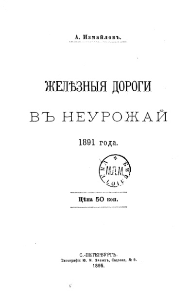 Короткая книга, посвященная организации железнодорожных перевозок зерна для пропитания голодающих. Кроме собственно железнодорожных подробностей (весьма интересных), книга содержит также и весьма ценные экономические данные: сведения об объемах перевозок и колебаниях цен на хлеб в различных местностях.