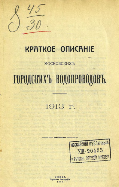 Любопытная техническая книжка, написанная, как и все техические издания того времени, очень доходчиво и живо. История сооружения московского водопровода, статистика его деятельности, экономическая часть и подробное описание технического устройства. Много хороших иллюстраций: схема водопровода, планы водопроводных станций, чертежи сооружений водопровода.