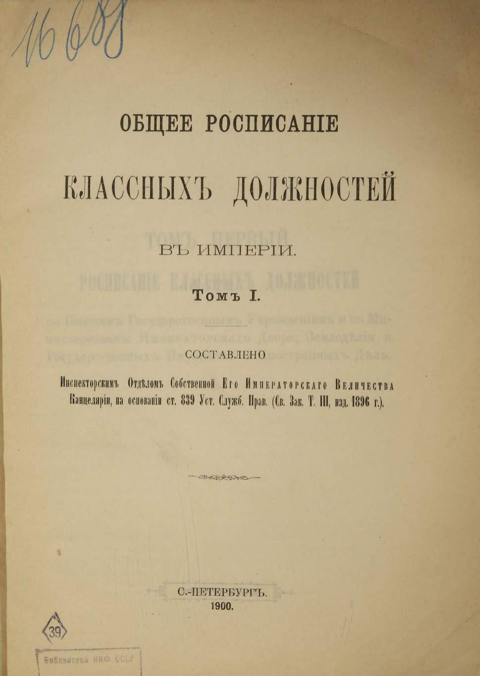 Свод огромного количества отдельных штатов, составленный Инспекторским отделом Собственной Е.И.В.Канцелярии. Все должности разделены по ведомствам. Для некоторых должностей дается количество чиновников, их занимающих, а для некоторых нет. Таким образом, расписание позволяет понять класс всех должностей в империи и присвоенное им денежное содержание, но не количество чиновников, занимающих эти должности.