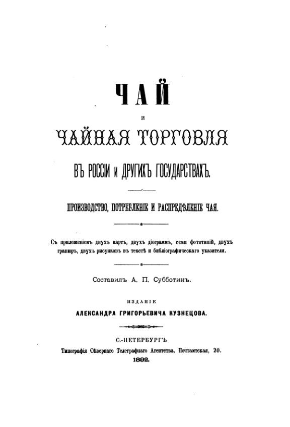 Уникальное издание - подробнейший рассказ об устройстве небольшой отрасли, чайного производства и торговли, по всей цепочке от производителя до потребителя. Это просто энциклопедия: сорта чая, культура чая, ботаническая сторона дела, организация международной торговли, транспорт, налоги и пошлины, внутренняя торговля, сорта и цены на внутреннем рынке, маркетинг, поблемы фальсификации, сопоставления с другими государствами. В принципе, это отличное микроэкономическое исследование, показывающее, как, через какие механизмы экономика того времени разрешала одну отдельную проблему, а именно желание людей пить чай.