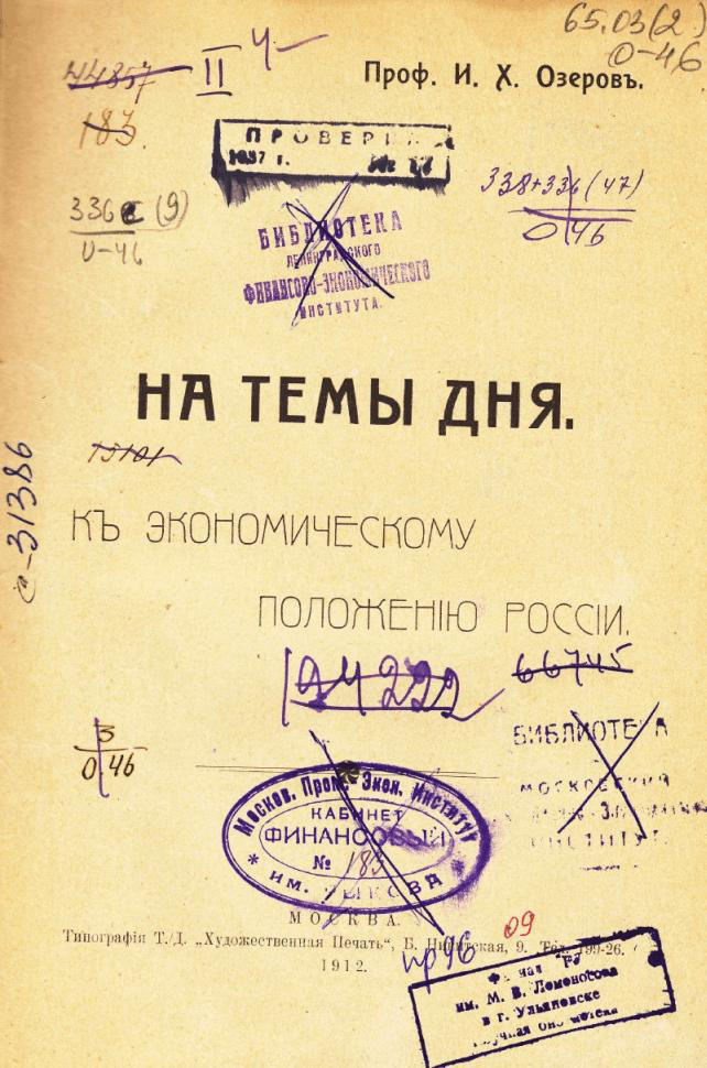 Сборник статей, написанных за 1912 год известным и плодовитым экономическим публицистом Иваном Озеровым. Статьи разнотемные и беглые, от нехватки в обороте медной монеты до описания оживления на бирже и неведомого страхования учащихся. Много статистических данных, редкостных сведений и неожиданных замечаний.