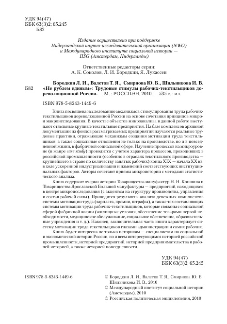 «Не рублем единым»: Трудовые стимулы рабочих-текстильщиков дореволюционной России