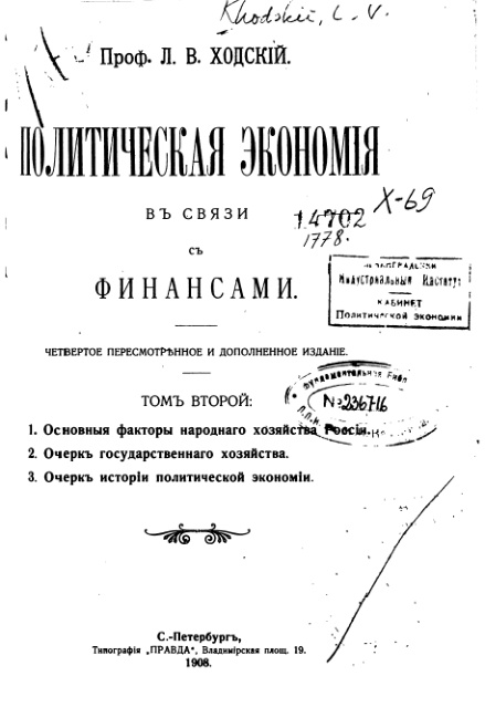 Учебник политической экономии, по современным понятиям производящий впечатления введения в экономию - собственно научной теории в нем нет, есть только введение в основные темы и объяснение базовых терминов и понятий. Но и это достаточно интересно. Весьма интересно изложено распределение население по уровню и источникам доходов, по данным обследований к предполагаемому введению подоходного налога. Налоги излагаются также в интересной подаче, в сравнении с практикой развитых стран. В целом, много межстрановых сопоставлений, хорошей сводной статистики и т.д. К сожалению, доступен только второй том.