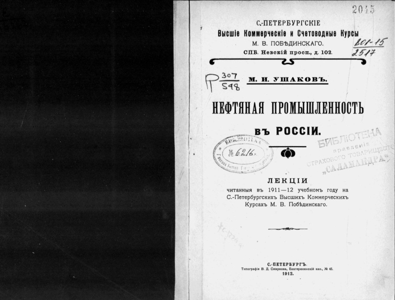 Лекционный курс Высших коммерческих курсов (1911-12 годы), чрезвычайно толковый и удобопонятный. Автор рассматривает добычу нефти со всех сторон: описание месторождений, методика добычи, переработка, коммерческая сторона дела, цены, новые технологии. Описание не академично, видно, что автор действительно знаком с делом. Курс не перегружен статистикой, но все цифровые данные по делу. Сейчас таких информативных коротких учебников не бывает.