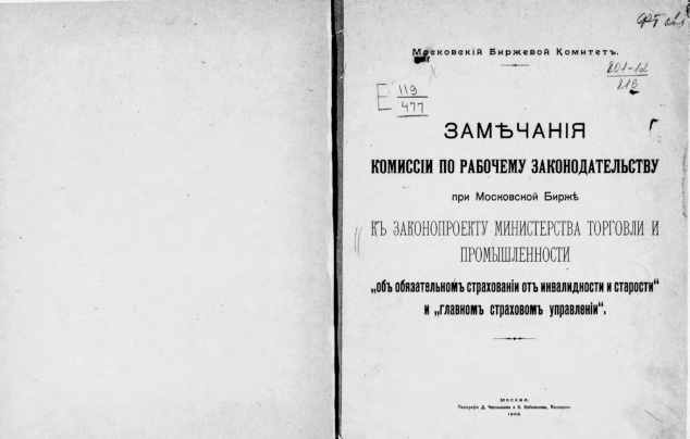Замечания Комиссии по рабочему законодательству при Московской бирже к законопроекту Министерства торговли и промышленности "Об обязательном страховании от инвалидности и старости" и "Главном страховом управлении"