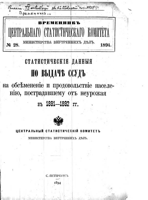 Статистические данные по выдаче ссуд на обсеменение и продовольствие населению, пострадавшему от неурожая в 1891-1892 гг.