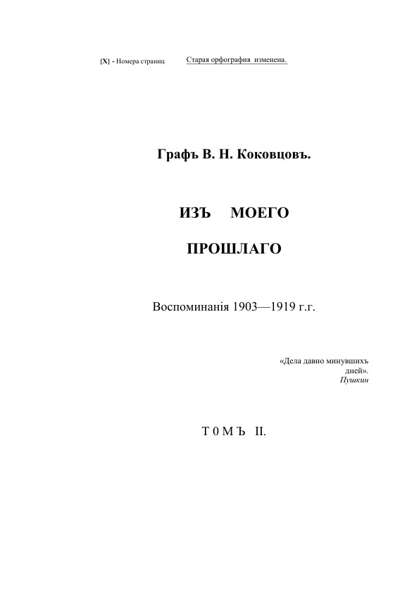 Мемуары многолетнего министра финансов, а затем и премьер-министра В.Н.Коковцова. Одни из самых обширных и подробных русских чиновничьих мемуаров. Мемуары выражают личность Коковцова - обстоятельность, спокойствие, скучность, добросовестность рассказа при отсутствии ярких идей и впечатлений. Видел и помнил Коковцов очень многое, поэтому мемуары исключительно содержательны.