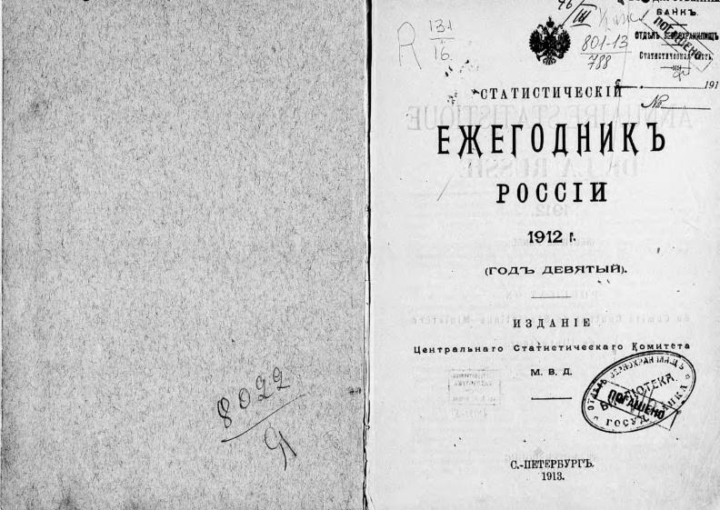 • Огромный по объему и очень информативный официальный ежегодный справочник. Площадь и численность населения по губерниям и уездам. Распределение населения по полу, возрасту, вероисповеданию, национальности изанятиям. Смертность, рождаемость и брачность. Движение переселенцев и эмигрантов. Статистика землевладения, движение земель, цены на землю. Урожайность и сборы основных сельскохозяйственных культур, поголовье скота. Экспорт и импорт сельхозпродуктов. Количество фабрик и заводов. Производство, экспорт и импорт горнозаводской промышленности. Импорт и экспорт по границам, таможням и товарным группам. Параметры железнодорожной сети и внутренних водных путей. Статистика преступности: количество судебных дел, осужденных и заключенных. Государственный бюджет. Городские и земские бюджеты. Свобные балансы Госбанка и различных групп частных и общественных банков, сберегательных касс..