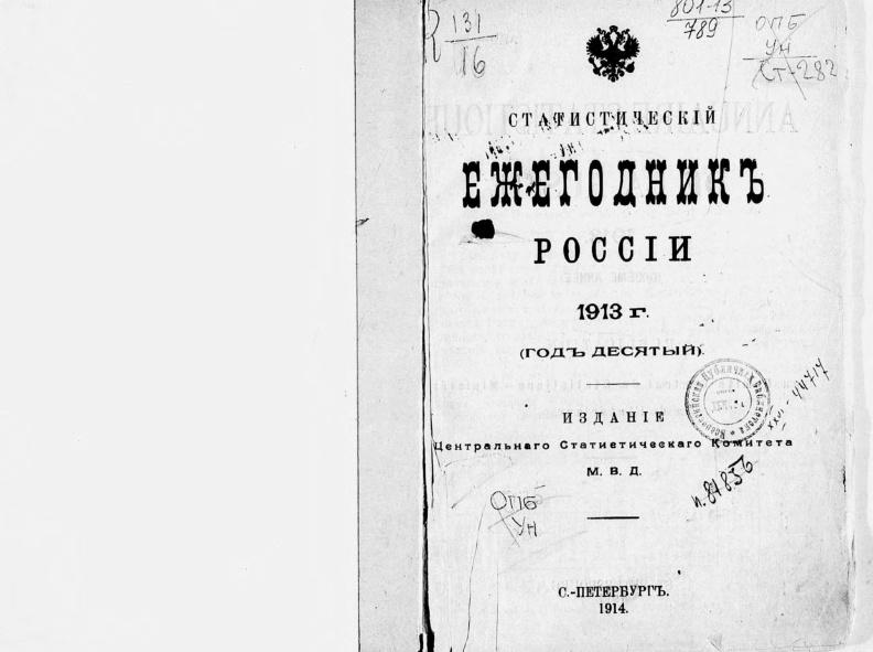 • Огромный по объему и очень информативный официальный ежегодный справочник. Площадь и численность населения по губерниям и уездам. Распределение населения по полу, возрасту, вероисповеданию, национальности изанятиям. Смертность, рождаемость и брачность. Движение переселенцев и эмигрантов. Статистика землевладения, движение земель, цены на землю. Урожайность и сборы основных сельскохозяйственных культур, поголовье скота. Экспорт и импорт сельхозпродуктов. Количество фабрик и заводов. Производство, экспорт и импорт горнозаводской промышленности. Импорт и экспорт по границам, таможням и товарным группам. Параметры железнодорожной сети и внутренних водных путей. Статистика преступности: количество судебных дел, осужденных и заключенных. Государственный бюджет. Городские и земские бюджеты. Свобные балансы Госбанка и различных групп частных и общественных банков, сберегательных касс..
