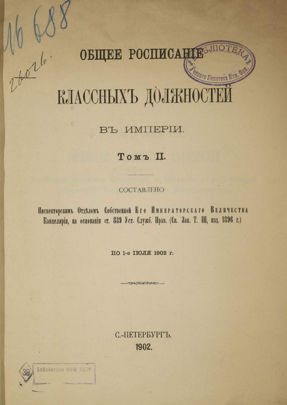 Свод огромного количества отдельных штатов, составленный Инспекторским отделом Собственной Е.И.В.Канцелярии. Все должности разделены по ведомствам. Для некоторых должностей дается количество чиновников, их занимающих, а для некоторых нет. Таким образом, расписание позволяет понять класс всех должностей в империи и присвоенное им денежное содержание, но не количество чиновников, занимающих эти должности.