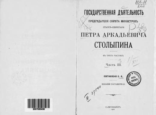 Большая, пестрая и бессистемная компиляция, посвященная деятельности Столыпина. Законодательные акты, речи Столыпина, выдержки из протоколов Думы и Государственного Совета, газетные статьи, различные официальные бумаги (законопроекты и т.д.). Подробная хроника визита в Киев, в ходе которого Столыпин был убит. Масса интересных сведений, которые надо вылавливать из неструктурированного материала.