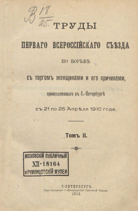 Труды Первого Всероссийского Съезда по борьбе с торгом женщинами и его причинами, происходившего в С.-Петербурге с 21 по 25 апреля 1910 года. Том 2