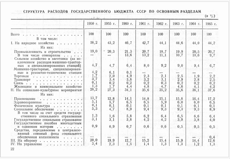 Содержит сведения о расходах, приходящихся на разные цели, по государственному бюджету СССР в периоды 1950, 1955, 1960-1965 в процентах.