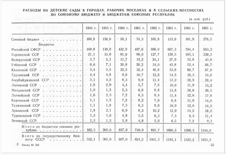 Содержит сведения о расходах на детские сады в городах, рабочих поселках и в сельских местностях по союзному бюджету и бюджетам союзных республик в периоды 1950, 1955, 1960-1965 в миллионах рублей.
