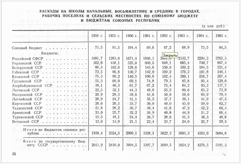 Содержит сведения о расходах на школы начальные, восьмилетние и средние в городах, рабочих поселках и сельских местностях по союзному бюджету и бюджетам союзных республик в периоды 1950, 1955, 1960-1965 в миллионах рублей.