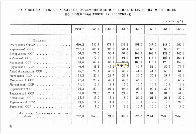Содержит сведения о расходах на школы начальные, восьмилетние и средние в сельских местностях по бюджетам союзных республик в периоды 1950, 1955, 1960-1965 гг. в миллионах рублей.