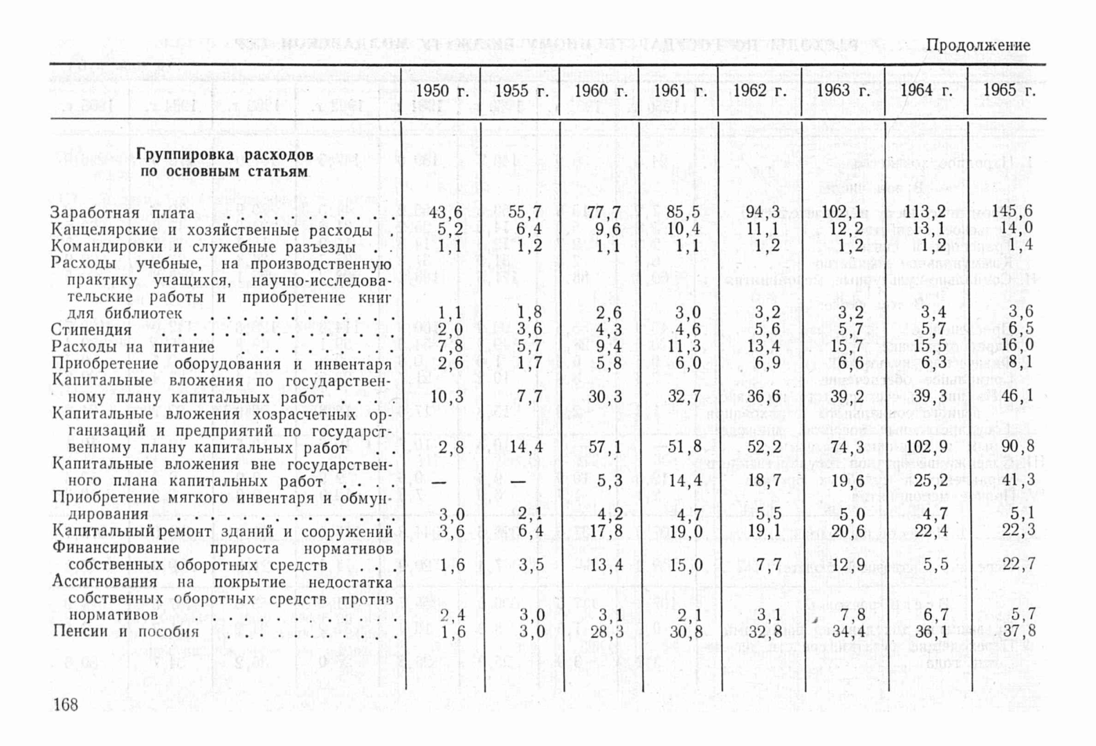 Содержит сгруппированные по основным статьям расходы по государственному бюджету Молдавской ССР в периоды 1950, 1955, 1960-1965 в миллионах рублей.