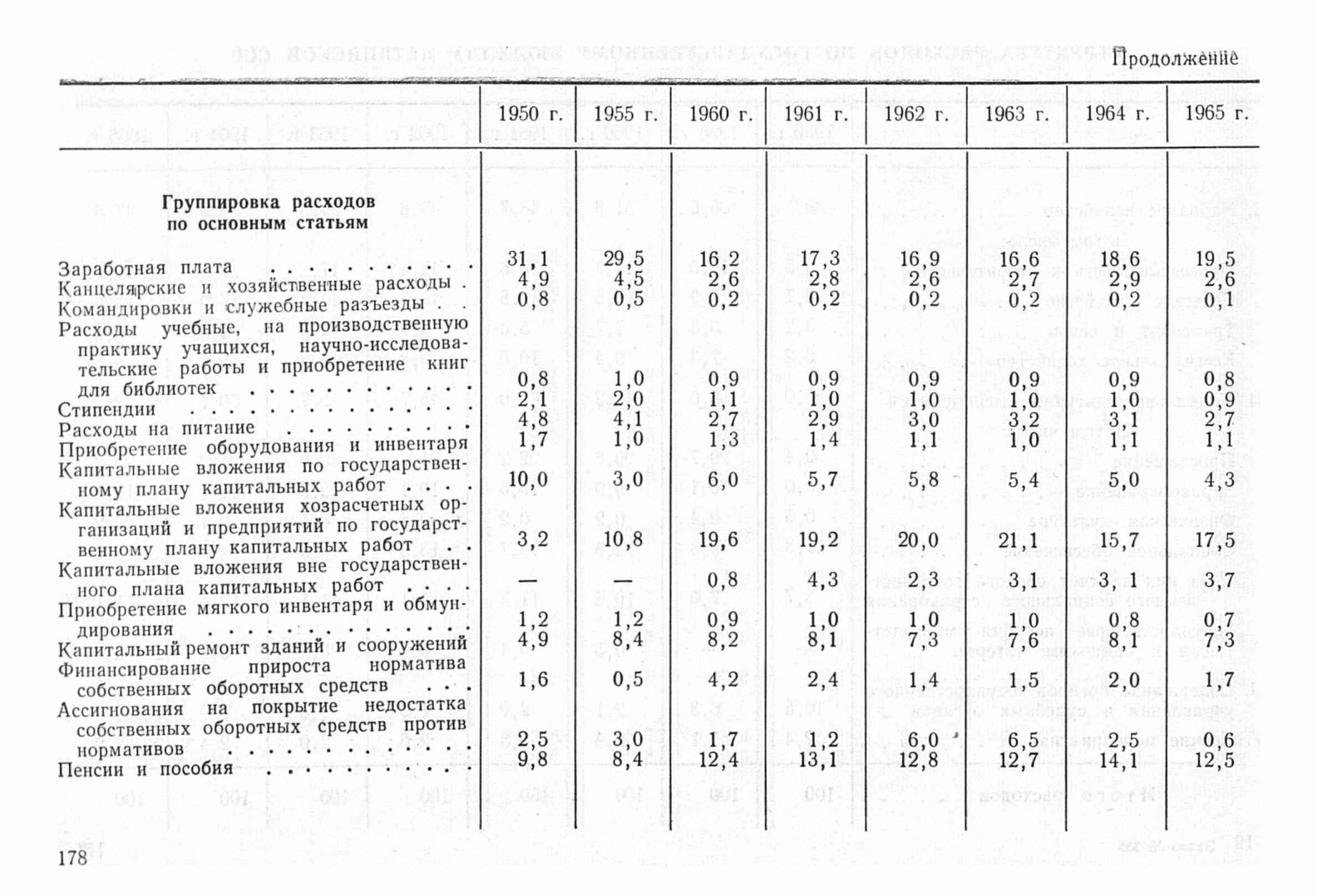 Содержит сгруппированные по основным статьям доли расходов по государственному бюджету Латвийской ССР в периоды 1950, 1955, 1960-1965 в процентах.
