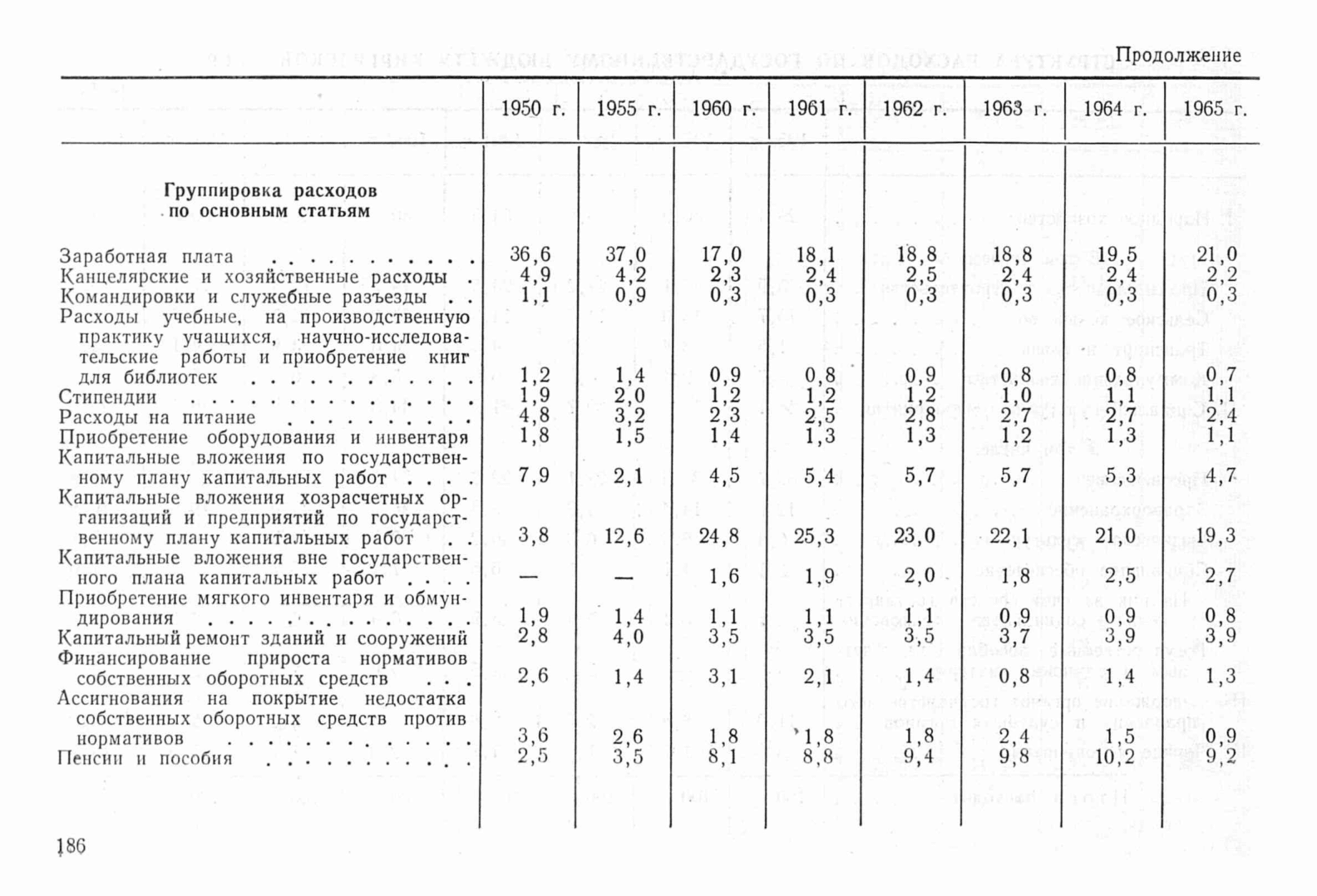 Группировка расходов по государственному бюджету Киргизской ССР по основным статьям в периоды 1950, 1955, 1960-1965 годов (в %)
