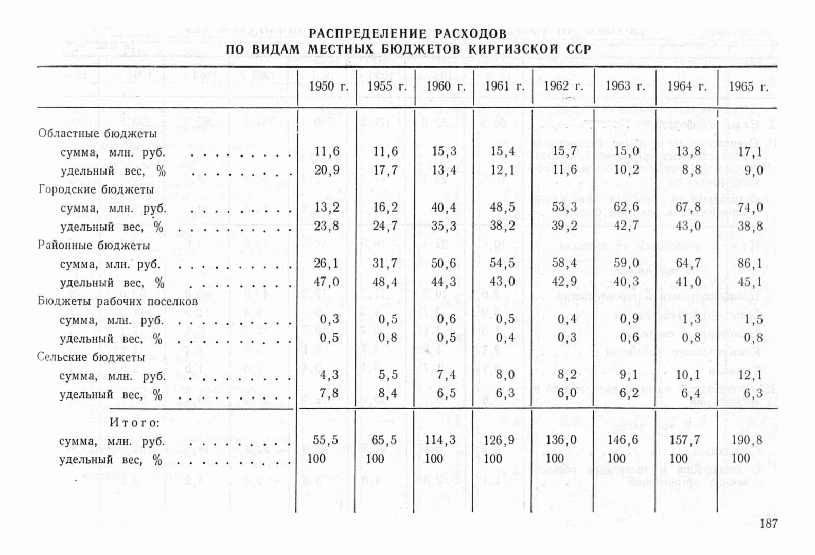 Содержит сведения о распределении расходов по видам местных бюджетов Киргизской ССР в периоды 1950, 1955, 1960-1965 в миллионах рублей и в процентах.