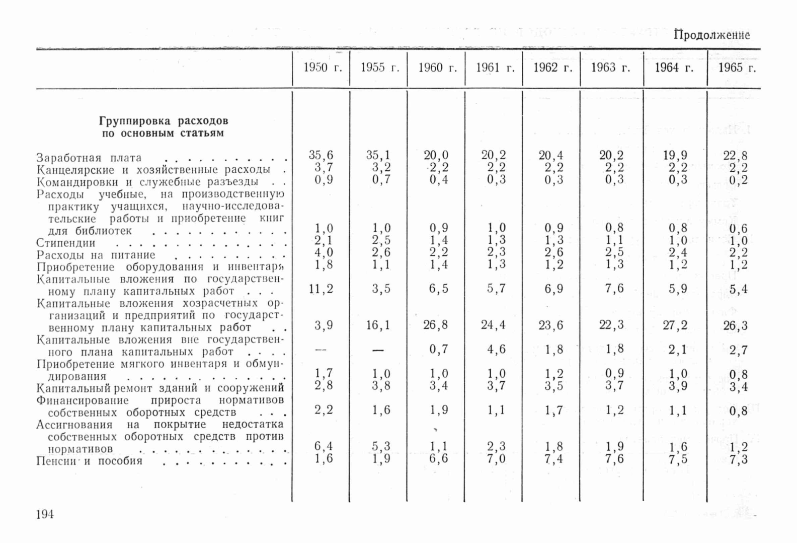 Содержит сгруппированные по основным статьям доли расходов по государственному бюджету Таджикской ССР в периоды 1950, 1955, 1960-1965 в процентах.