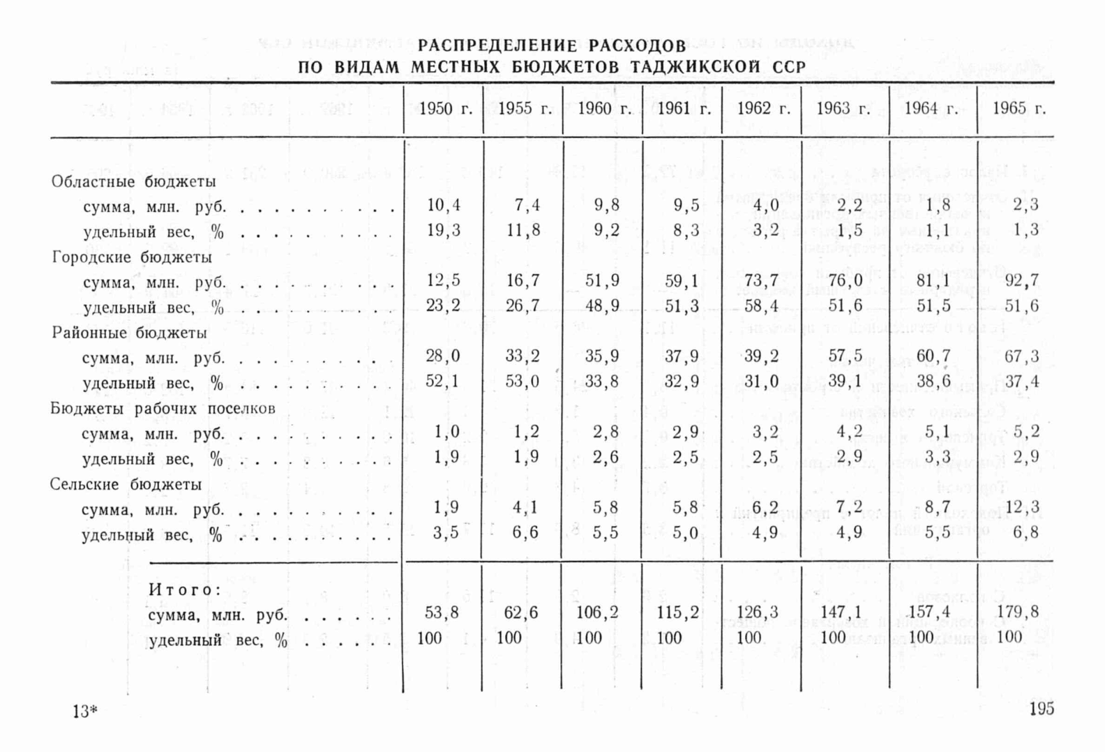 Содержит сведения о распределении расходов по видам местных бюджетов Таджикской ССР в периоды 1950, 1955, 1960-1965 в миллионах рублей и в процентах.