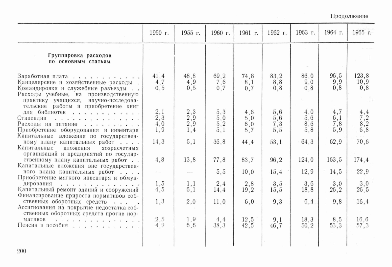 Группировка расходов по государственному бюджету Армянской ССР по основным статьям в периоды 1950, 1955, 1960-1965 годов (в млн руб.)