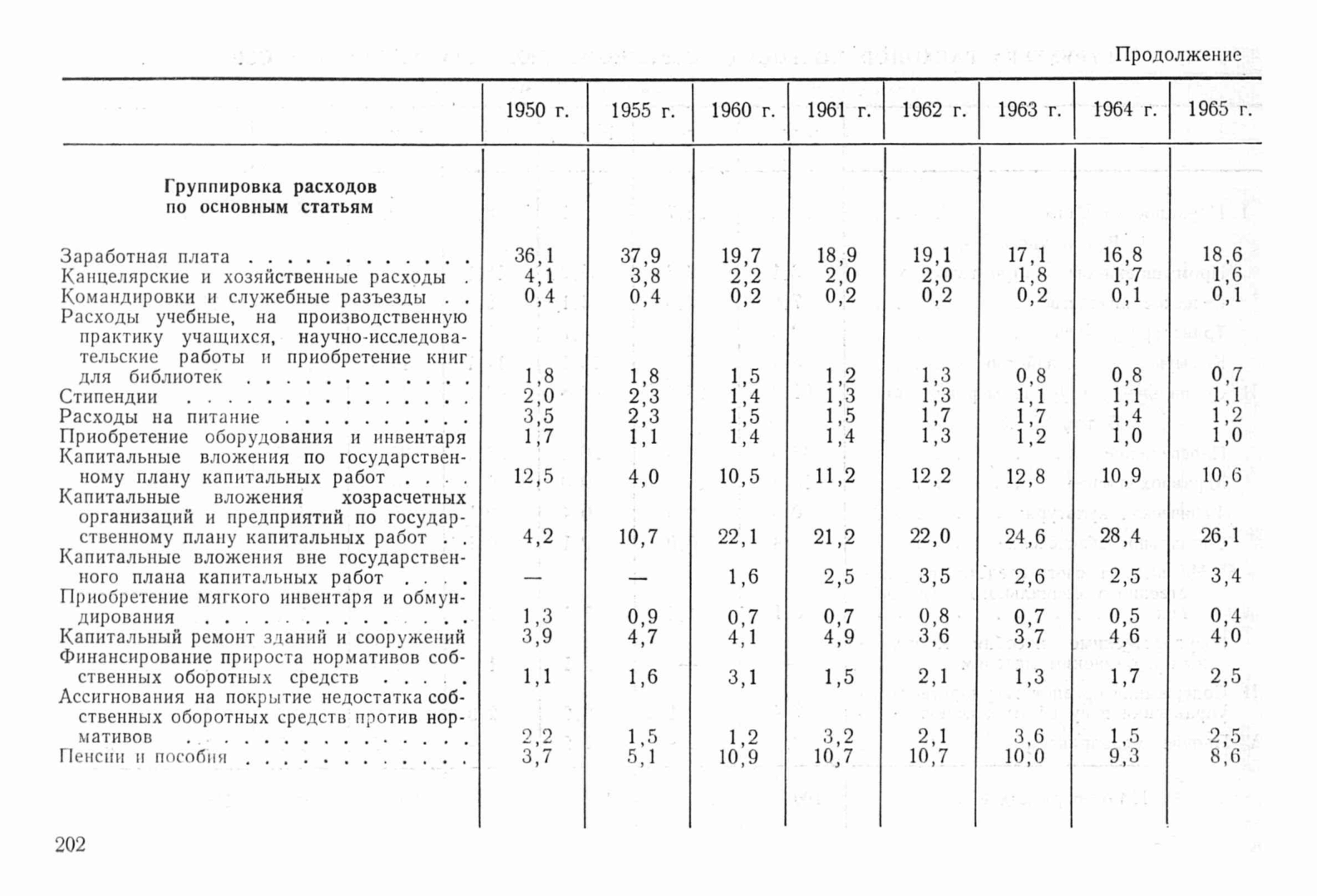 Содержит сгруппированные по основным статьям доли расходов по государственному бюджету Армянской ССР в периоды 1950, 1955, 1960-1965 в процентах.