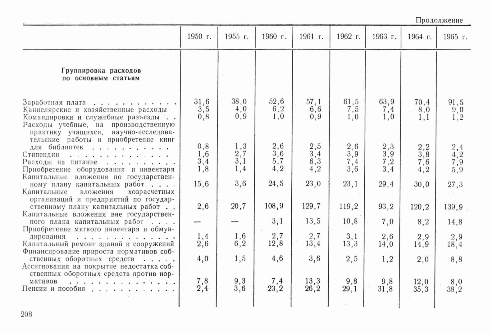 Содержит сгруппированные по основным статьям расходы по государственному бюджету Туркменской ССР в периоды 1950, 1955, 1960-1965 в миллионах рублей.