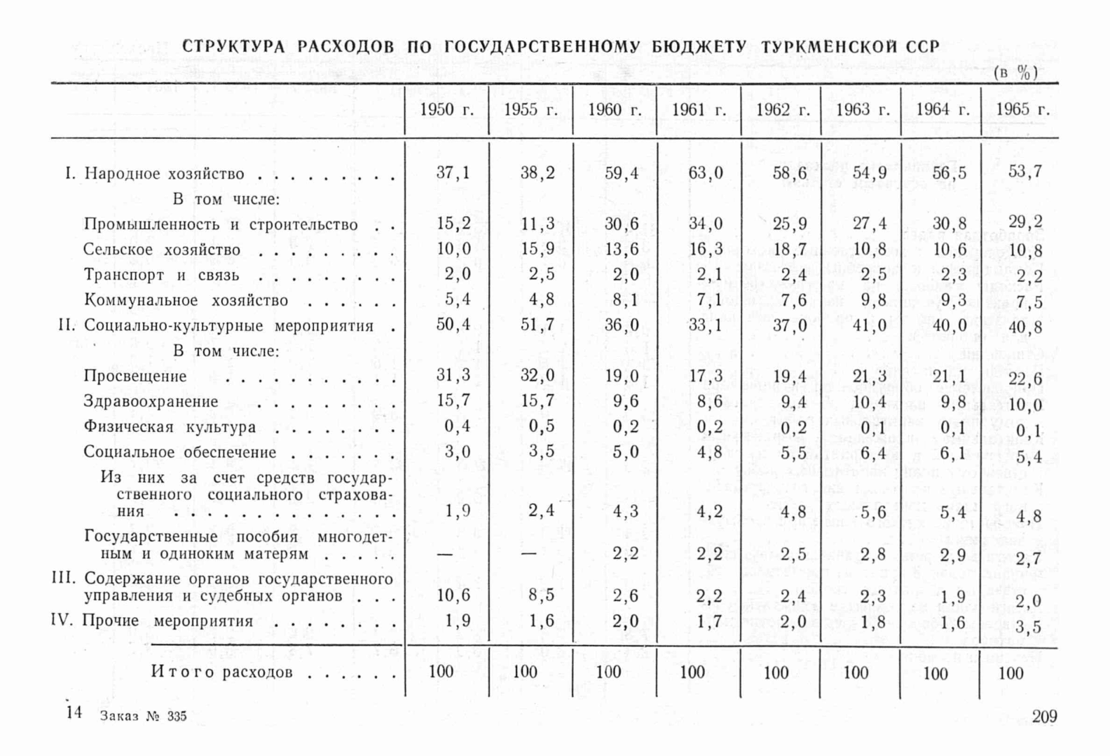 Содержит сведения о расходах, приходящихся на разные цели, по государственному бюджету Туркменской ССР в периоды 1950, 1955, 1960-1965 в процентах.