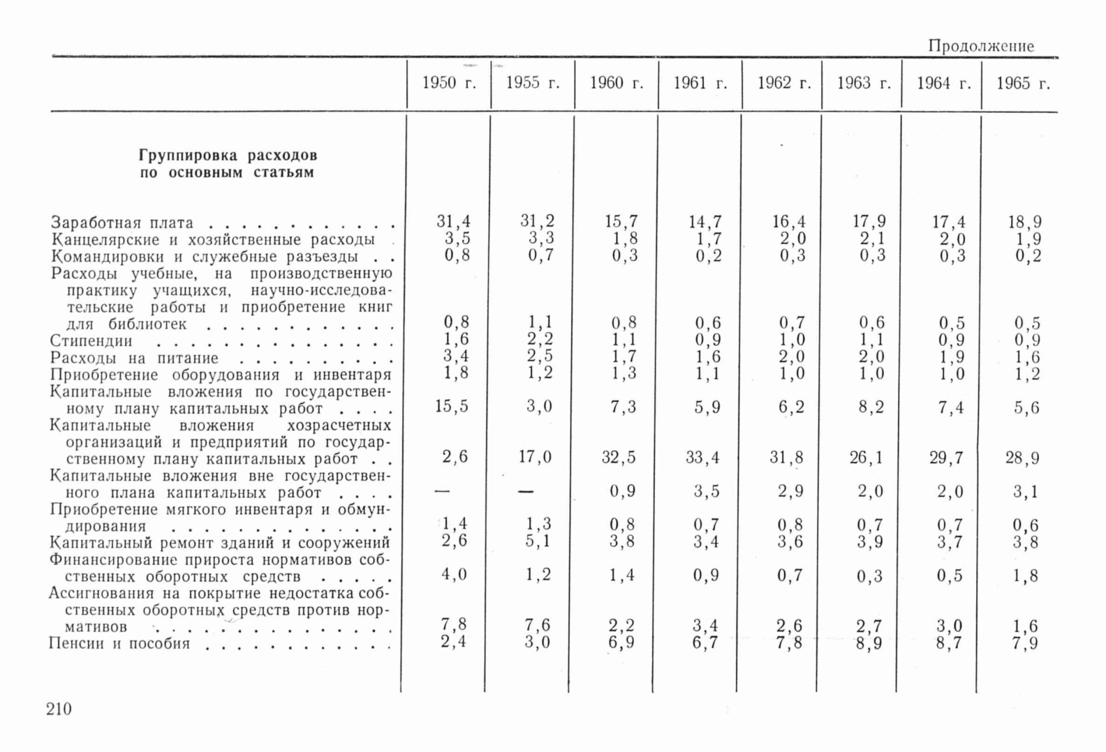 Содержит сгруппированные по основным статьям доли расходов по государственному бюджету Туркменской ССР в периоды 1950, 1955, 1960-1965 в процентах.
