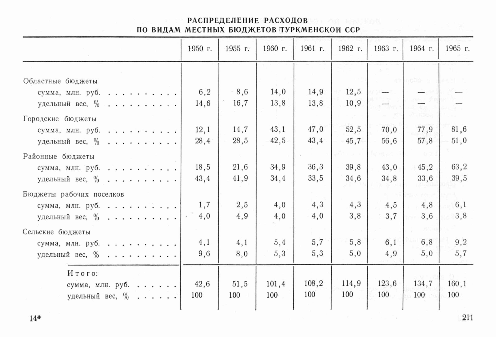 Содержит сведения о распределении расходов по видам местных бюджетов Туркменской ССР в периоды 1950, 1955, 1960-1965 в миллионах рублей и в процентах.