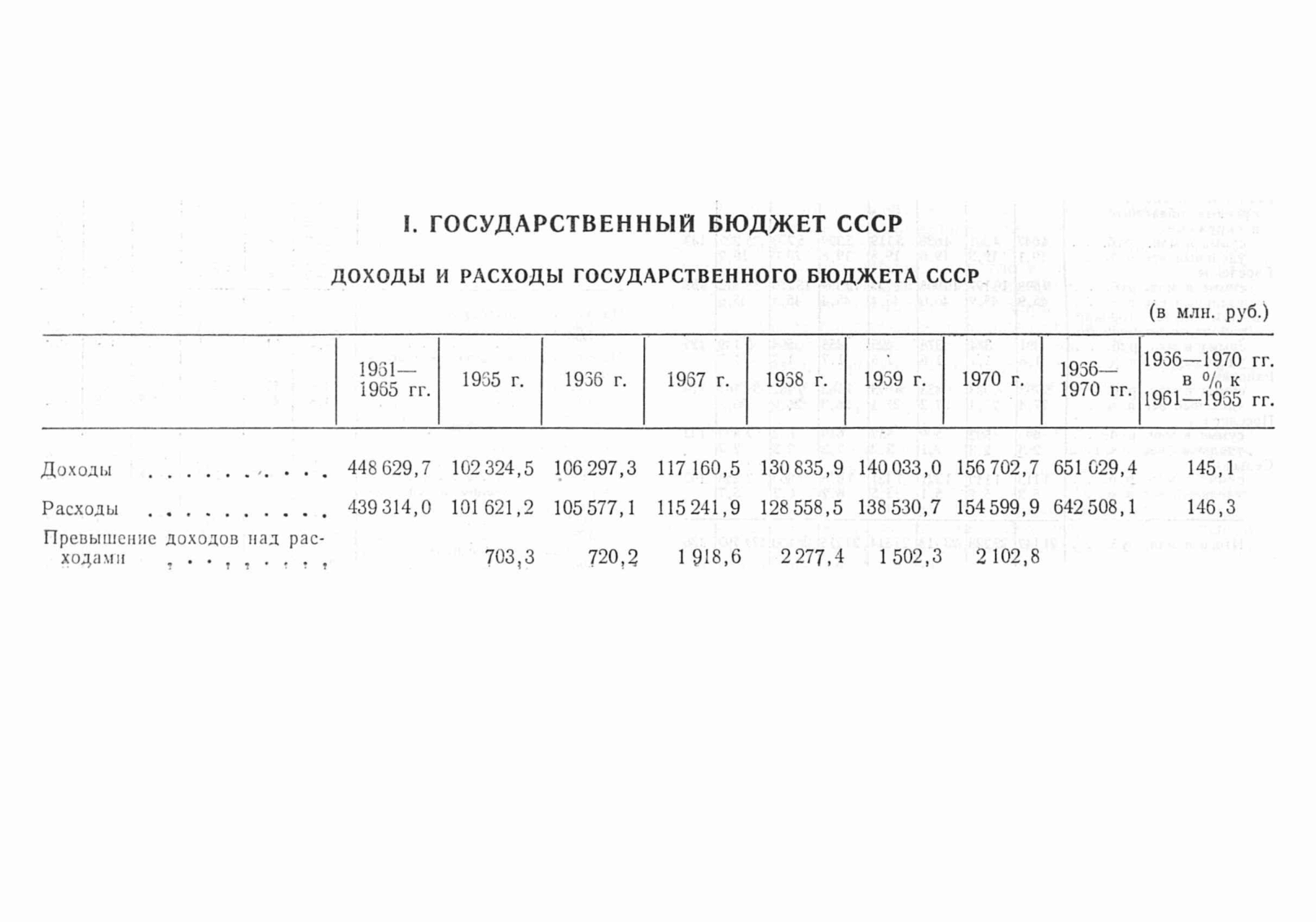 Содержит сведения о доходах и расходах государственного бюджета СССР в периоды 1960-1965 и 1966-1970 годов в миллионах рублей.