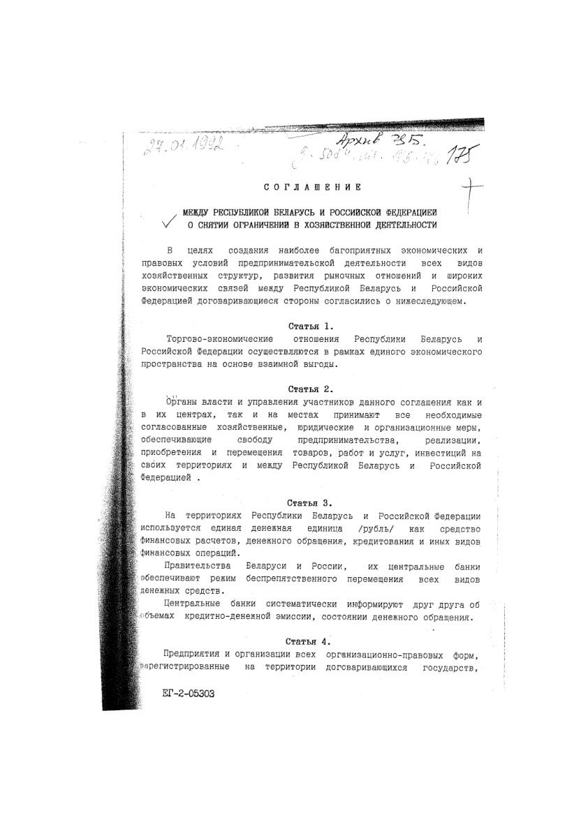 Соглашение между Белоруссией и РФ о снятии ограничений в хозяйственной деятельности.
