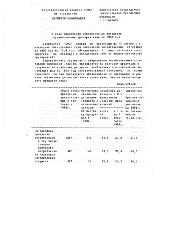Госкомстат - Гайдару Е.Т. О ходе заключения хозяйственных договоров промышленными предприятиями на 1992 г.