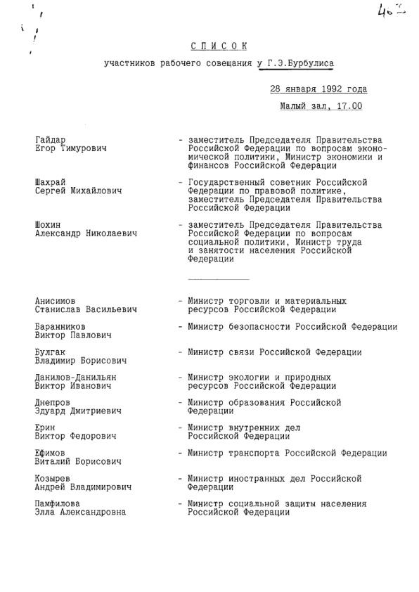 Список участников рабочего совещания у Г.Э. Бурбулиса.